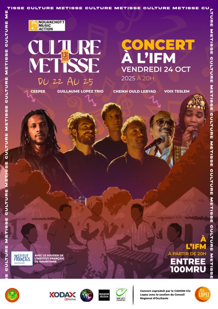 Nouakchott Music Action a le plaisir de vous présenter la 13ème édition du festival Culture Métisse, une célébration musicale qui aura lieu à Nouakchott ce vendredi 24 octobre 2025 à l’institut français de Mauritanie et une scène ouverte le samedi 25 octobre 2025 à JELOUA à partir de 20h.