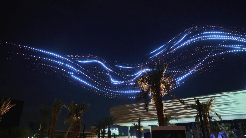 La cinquième édition de Noor Riyadh, tout aussi spectaculaire que les précédentes, s’est ouverte le 20 novembre dans la capitale saoudienne. Sous les yeux des spectateurs, 3 500 drones, orchestrés comme des feux d’artifice par Christophe Berthonneau et László Zsolt Bordos, ont donné le ton d’un festival qui, à bien des égards, se place sous le signe de la rapidité. « The Blink of an Eye – le clin d’œil – renvoie à la vitesse de la lumière, à la vitesse du temps, et nous rappelle que nous devons aussi regarder vers le Temps, avec un T majuscule », résume Mami Kataoka, directrice du Mori Art Museum de Tokyo et commissaire en chef invitée. Pendant 16 jours, jusqu’au 6 décembre, on peut découvrir les 60 œuvres que les commissaires Sara Almutlaq (pour les artistes saoudiens) et Li Zhenhua (spécialisé dans les nouveaux médias) ont sélectionnées pour raconter le changement rapide d’une ville qui s’affirme de plus en plus comme un centre culturel international dans la région. Les œuvres d’art sont réparties sur six sites, entre les architectures historiques et les stations du nouveau métro au design futuriste, inauguré il y a à peine un an, signe clair de la modernisation de la ville. Le potentiel transformateur de la lumière, élément à la fois spirituel et matériel, est exploré par les 59 artistes – dont 13 Saoudiens – à travers des œuvres poétiques et technologiques, qui transmettent « ce flash de transformation, tout en visant à intégrer l’art dans la vie quotidienne », rappelle la directrice, Nouf AlMoneef. Une promenade qui sollicite le spectateur entre des installations à grande échelle – Nebras Aljoaib, Muhannad Shono, Loris Cecchini, fuse* ; beaucoup d’écrans, dont certains interactifs – Ziyad Alroqi, Alexandra Gelis, Kurt Hentschläger, n + n Corsino ; des installations où se révèle la rencontre magique de la lumière et du mouvement – Shiro Takatani, Shinji Ohmaki, Rejane Cantoni, Shun Ito, Guillaume Cousin. « Grâce aux initiatives artistiques, davantage de jeunes choisissent cette voie, intégrant la technologie dans leur pratique. Dans dix ans, nous assisterons à l’émergence de nombreux artistes », raconte Sara Almutlaq. Le Diriyah Art Futures, musée tout récent dédié aux nouveaux médias, propose des résidences de 11 mois pour accompagner de jeunes talents dans la création d’œuvres multidisciplinaires.